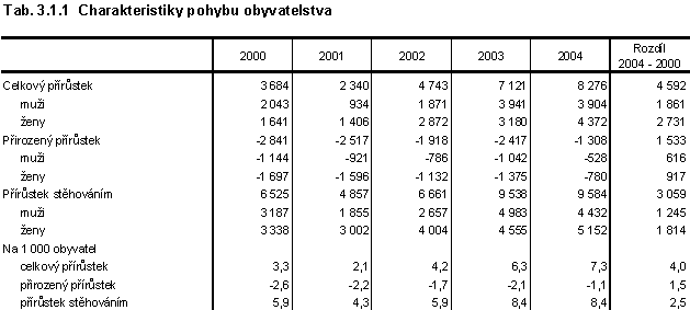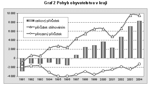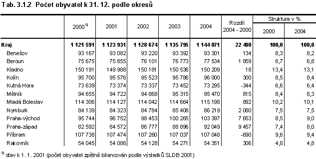 Ve Středočeském kraji žilo ke konci roku 2004 celkem 1 144 071 obyvatel, což představuje 11,2 % obyvatel Česka. Podíl Středočeského kraje na obyvatelstvu republiky se od počátku sledovaného období zvyšuje – na začátku roku 2000 dosahoval hodnoty 10,8 %. Důvodem je neustálý výrazný růst počtu obyvatel, přičemž Středočeský kraj je jediný mezi všemi kraji republiky, kde k tak velkému nárůstu dochází. Do roku 1996 docházelo ve Středočeském kraji k celkovému úbytku počtu obyvatel, na čemž měl hlavní podíl úbytek přirozenou měnou. Od roku 1997 obyvatelstvo postupně přibývá. Důvodem je přírůstek stěhováním, ke kterému dochází již od roku 1992 a který je ve srovnání s ostatními kraji výrazně nejvyšší. Ve sledovaném období 2000-2004 se přírůstek stěhováním zvýšil zhruba o polovinu (z 5,9 na 8,4 promile) a ovlivňuje i přirozenou měnu obyvatel. Díky struktuře přistěhovalých, kteří jsou většinou mladší a zakládají v kraji své rodiny, se postupně snižuje úbytek přirozenou měnou (z -2,6 na -1,1 promile). Výsledkem je více než zdvojnásobení celkového přírůstku z 3,3 promile v roce 2000 na 7,3 promile v roce 2004. Mezi roky 2000 a 2004 přibylo v kraji téměř 22,5 tisíc obyvatel.
