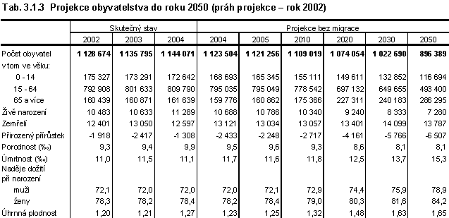 Odhady budoucího vývoje velikosti a demografické struktury určité sledované populace či jejích částí se nazývají populační projekce. Projekci obyvatelstva Středočeského kraje do roku 2050 ukazuje tabulka 3.1.3. Základním údajem pro výpočet byly počty obyvatel podle pohlaví a jednotek věku v kraji vybilancované k 31. 12. 2002 (práh projekce). Parametry plodnosti (specifické plodnosti žen) a úmrtnosti (koeficienty dožití) byly stanoveny na základě analýzy populačního vývoje podle tříletých průměrů za roky 2000-2002. K výpočtu projekce byla použita komponentní metoda, která umožňuje na základě věkové struktury podle pohlaví a údajích o řádu vymírání (vyjádřenému úmrtnostní tabulkou) a řádu rození (vyjádřenému specifickými mírami plodnosti) vypočítat nejen počet, ale i budoucí věkovou strukturu populace. Metoda je založena na principu posouvání věkových skupin, tj. jejich zmenšování vlivem úmrtnosti a doplňování na základě předpokládané intenzity plodnosti. Předkládaná projekce je vypočítána bez vlivu vnitřní i zahraniční migrace (z důvodu její obtížné předpovídatelnosti) a ukazuje tedy na hypotetický vývoj počtu a složení obyvatelstva kraje, ovlivněný pouze přirozenou měnou obyvatel.