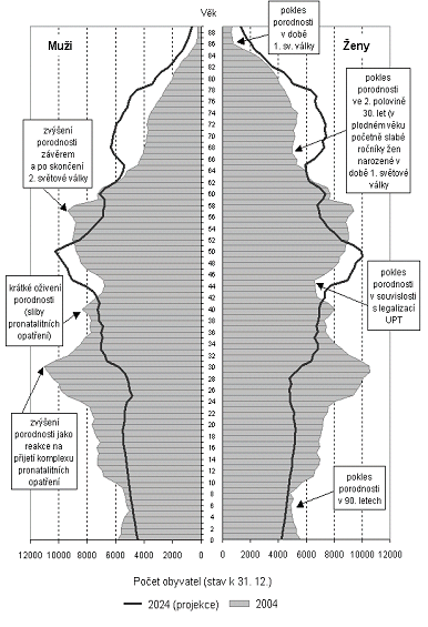 Z demografického hlediska můžeme populaci rozdělit na 3 skupiny – na dětskou složku (0-14 let), reprodukční složku (definovanou rodivým věkem žen 15-49 let) a postreprodukční složku (nad 50 let). Reprodukční složka obecně tvoří zhruba 50 % z celkového počtu obyvatel, což platí i v případě Středočeského kraje. Podle zastoupení zbylých dvou složek určujeme typ věkové struktury. Středočeský kraj vykazuje regresivní typ věkové struktury, což znamená, že zde postreprodukční složka převyšuje složku dětskou a následkem je úbytek počtu obyvatel. Z tabulky 3.2.1 je patrné, že se převaha postreprodukční složky nad dětskou mezi roky 2000 a 2004 prohloubila. Grafickým vyjádřením věkové struktury je tzv. věková pyramida (graf 3), z níž je na první pohled patrný typ věkové struktury obyvatelstva. Úzká základna pyramidy Středočeského kraje vyjadřuje nízkou úroveň porodnosti v poslední době, což ukazuje na regresivní typ věkové struktury obyvatelstva. Popis a vysvětlení jednotlivých „zářezů“ a „výstupků“ ve věkové pyramidě je uveden přímo v grafu.