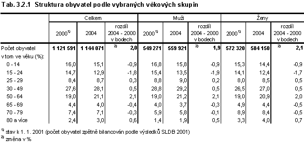 Struktura obyvatelstva podle věku a pohlaví patří mezi základní demografické struktury obyvatelstva. Věková struktura obyvatelstva ovlivňuje řadu demografických charakteristik a budoucí demografický vývoj. Tabulka 3.2.1 ukazuje věkovou strukturu obyvatelstva Středočeského kraje a její vývoj mezi roky 2000 a 2004. Je patrné snižování podílu dětské složky a obyvatel ve věkové skupině 15-24 let a dále snižování podílu starých obyvatel nad 65 let. Zvyšuje se naopak podíl lidí ve věku 25-64 let, k čemuž ve velké míře přispívá struktura přistěhovalých osob.