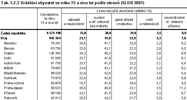 Ačkoli úroveň vzdělání ve Středočeském kraji mezi jednotlivými sčítáními průběžně roste (což je celospolečenský trend), pohybuje se stále na nižší úrovni než v rámci celé republiky. Středočeský kraj vykazuje nižší podíl vysokoškolsky vzdělaných a středoškoláků s maturitou, zatímco podíl obyvatel bez maturity je vyšší než v republice. Úroveň vzdělanosti je vyšší v obcích s větším počtem obyvatel, platí tedy, že s narůstajícím počtem obyvatel obcí se zvyšuje vzdělanostní úroveň obyvatelstva. Nejmenší obce vykazují nejvyšší podíl obyvatel pouze se základním vzděláním, zatímco zastoupení vysokoškoláků je nejvyšší v největších městech. Výjimku tvoří město Kladno, kde je úroveň vzdělanosti nižší než v menších městech vzhledem k horší socioekonomické situaci.