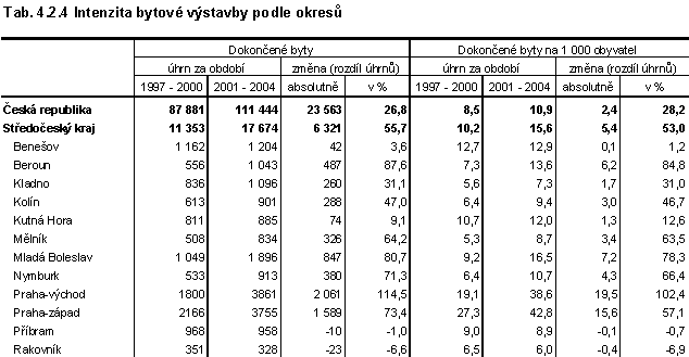 Okres Mladá Boleslav se vedle pražských okresů dostal ještě spolu s okresem Benešov do první desítky okresů s nejvyšší intenzitou bytové výstavby v rámci celé republiky v období 1997-2004. V Mladé Boleslavi ovlivnil celkový výsledek intenzity bytové výstavby především rok 2003, kdy bylo dokončeno velké množství bytů. V ostatních letech se jedná spíše o průměrné hodnoty. Okres Benešov, jehož severní část spadá do širšího zázemí Prahy a je díky dobré dostupnosti (dálnice D1) navázána na Prahu, je ve velké míře ovlivněn suburbanizačním procesem. Do první poloviny středočeských okresů s nejvyšší intenzitou se dostal ještě okres Beroun, který také tvoří širší zázemí Prahy a má s Prahou silné ekonomické vazby.