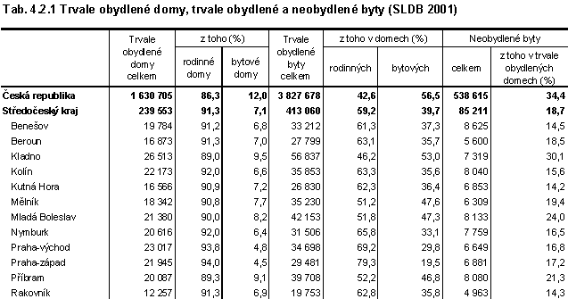 Při sčítání 2001 bylo ve Středočeském kraji sečteno téměř 240 tisíc trvale obydlených domů, což představuje více než šestinu trvale obydleného domovního fondu České republiky, a 413 tisíc trvale obydlených bytů, to je asi desetina trvale obydlených bytů republiky. Od roku 1991 se počet trvale obydlených domů zvýšil téměř o 2 %, v rámci okresů byl však tento nárůst zcela odlišný. Zatímco čtyři okresy zaznamenaly nepatrný pokles počtu trvale obydlených domů (Kolín, Kutná Hora, Rakovník, Benešov), u ostatních okresů počet trvale obydlených domů narostl. Největšího přírůstku bylo dosaženo v okresech sousedících s Prahou – v Praze-západ a Praze-východ. U trvale obydlených bytů došlo k nárůstu ve všech okresech, nejvýrazněji opět v okrese Praha-západ a Praha-východ. Důvodem je masivní výstavba během 90. let soustředěná do okolí Prahy.