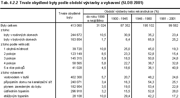 Z tabulky 4.2.2 je patrný trend výstavby stále větších bytů. Zatímco 10 % bytů s jednou místností pochází z nejstaršího období do roku 1899, pětipokojových bytů je z tohoto období pouze 4,5 %. Naopak v nejmladším období 1981-2001 byla postavena pouze jedna pětina bytů s jednou místností, zatímco u pětipokojových bytů se jednalo o dvě pětiny.