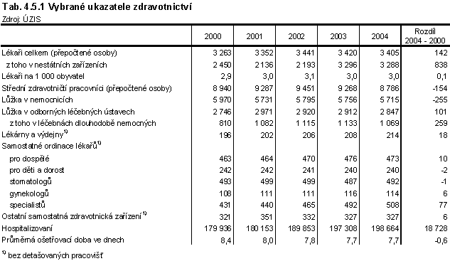 Celkový počet lékařů (včetně ambulantních) od roku 2000 do roku 2002 rostl, v dalších letech docházelo k mírnému poklesu jejich počtu. Rovněž počet lékařů na 1 000 obyvatel kulminoval v roce 2002, kdy na 1 000 obyvatel připadalo 3,1 lékaře, v roce 2004 klesl na 3 lékaře. Stejný vývoj zaznamenal i počet středního zdravotnického personálu, jen pokles byl prudší, takže v roce 2004 klesl počet středního zdravotnického personálu pod úroveň roku 2000.