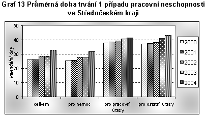 Ve vývoji nemocnosti a úrazovosti došlo v roce 2004 proti předchozím letům ke značným změnám. Při nepříliš velkých změnách počtu pojištěnců se v tomto roce významně snížil počet nově hlášených případů pracovní neschopnosti (PN) celkem. Na 100 pojištěnců bylo v letech 2000-2003 kolem 80 nově hlášených případů, v roce 2004 klesl na 60, tj. přibližně o jednu čtvrtinu. Výrazný pokles absolutního počtu nově hlášených případů (proti roku 2003 o 24 %) provázený poněkud pomalejším poklesem absolutního počtu kalendářních dnů pracovní neschopnosti (o 13 % proti roku 2003) měl za následek nárůst průměrné délky trvání jednoho případu pracovní neschopnosti z 28,7 dne v roce 2003 na 32,9 dne v roce 2004. V delší časové řadě je nárůst délky pracovní neschopnosti ještě výraznější. V roce 2000 trval jeden případ průměrně 26 dnů, v roce 1991 jen 20 dnů.
