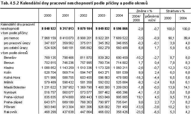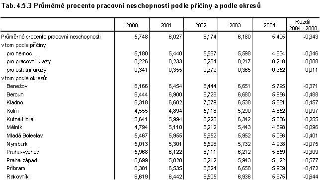 Mezi okresy Středočeského kraje dosahoval nejnižší procento pracovní neschopnosti okres Kolín i přesto, že to byl jediný okres, ve kterém hodnota tohoto ukazatele byla v roce 2004 vyšší než v roce 2000. Zcela opačný vývoj vykazují okresy Rakovník, Beroun a Příbram, ve kterých se i přes poměrně velký pokles udržuje průměrné procento pracovní neschopnosti na nejvyšších hodnotách.