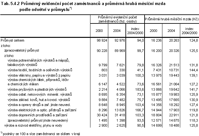 Snížení počtu pracovníků proti roku 2000 o více než 1,5 tisíce osob zaznamenala i odvětví výroby kovů, hutních a kovodělných výrobů, odvětví výroby nekovových minerálních výrobků, odvětví výroby potravinářských výrobků, nápojů a tabákových výrobků a odvětví výroby chemických látek, léčiv a chemických vláken. Některá odvětví zpracovatelského průmyslu vykázala v letech 2000-2004 zvýšení zaměstnanosti. Absolutně k nejvyššímu nárůstu počtu pracovníků proti roku 2000 došlo v odvětví výroby elektrických a optických přístrojů a zařízení, kde počet pracovníků vzrostl v roce 2004 proti roku 2000 o 5 530 osob, to je o 66,7 %. Ze všech průmyslových odvětví vykázalo relativně nejvyšší nárůst zaměstnanosti (o 83,6 % – přírůstek o 1 852 osob) odvětví výroby pryžových a plastických výrobků. Celkem o 994 osob, to je o 3,3 % se zvýšil počet pracovníků v odvětví výroby dopravních prostředků. Toto odvětví se na celkovém počtu pracovníků v průmyslu kraje v roce 2004 podílelo více než jednou třetinou.