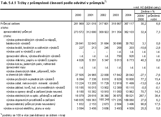 Tržby z průmyslové činnosti dosáhly v roce 2004 celkem 367,1 mld. Kč (v běžných cenách). Ve srovnání s rokem 2000 došlo k nárůstu tržeb z průmyslové činnosti o více než 30 %. Jejich nárůst byl jen v menší míře ovlivněn vývojem cen, neboť ceny průmyslových výrobků vzrostly v roce 2004 proti roku 2000 pouze o necelých osm procent.