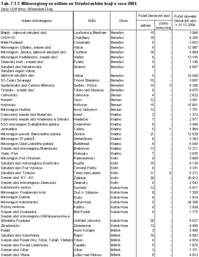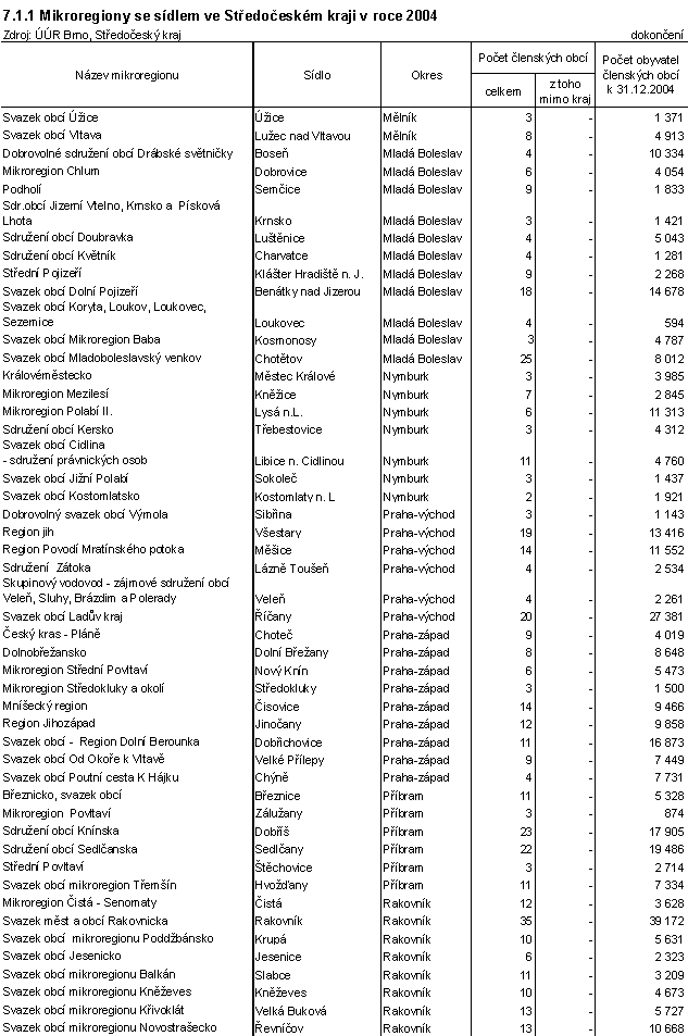 Podle šetření provedeného v roce 2005 Krajským úřadem Středočeského kraje bylo evidováno 234 mikroregionů, z toho 134 svazků obcí, dále 35 sdružení obcí, která vznikla před účinností zákona o obcích a nebyla dosud transformována na svazky obcí podle tohoto zákona a 65 zájmových sdružení právnických osob, jejichž členy jsou kromě obcí i další právnické osoby. Největší počet mikroregionů je složen z 6-10 obcí (cca 45 %), mikroregionů vzniklých spojením 2-5 obcí je cca 26 % a podíl mikroregionů tvořených více než 11 obcemi představuje cca 29 %.