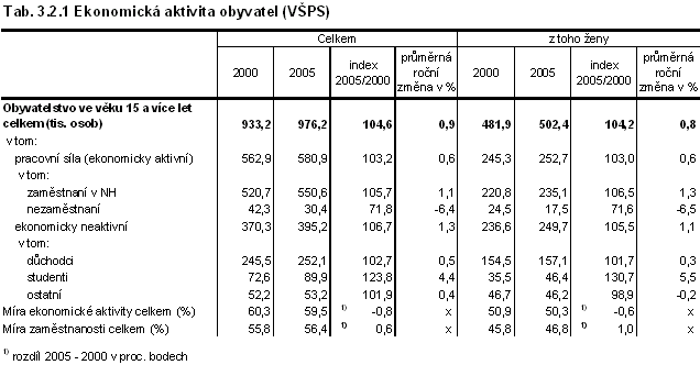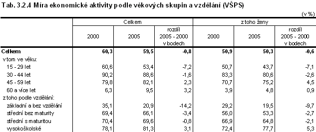 U žen je patrná potřeba zvyšování kvalifikace delším studiem, jak o tom svědčí pokles ekonomické aktivity ve věkové skupině 15-29 let do roku 2005 o více než 7 procentních bodů. Určitý vliv zvyšujícího se věku, kdy ženy odcházejí na mateřskou dovolenou se projevuje nejen u nejmladších věkových kategorií, ale zřejmě ještě ve skupině 30-44 let, kde proti roku 2000 došlo ke snížení ekonomické aktivity o 2,6 procentního bodu. Zvyšuje se míra ekonomické aktivity u žen nad 45 let, kde u věkové kategorie 45-59 vzrostla o 4,5 procentního bodu. U mužů v této věkové kategorii zůstala ekonomická aktivita prakticky na stejné úrovni jako v roce 2000 a dosahuje téměř 90 %. Ve věkové skupině nad 60 let naopak vzrostla ekonomická aktivita u mužů o více než 6 procentních bodů, u žen jen o necelý jeden procentní bod. I tak jsou tyto skutečnosti jasným důkazem prodlužování aktivní pracovní činnosti v důsledku zvyšování věkové hranice odchodu do důchodu.