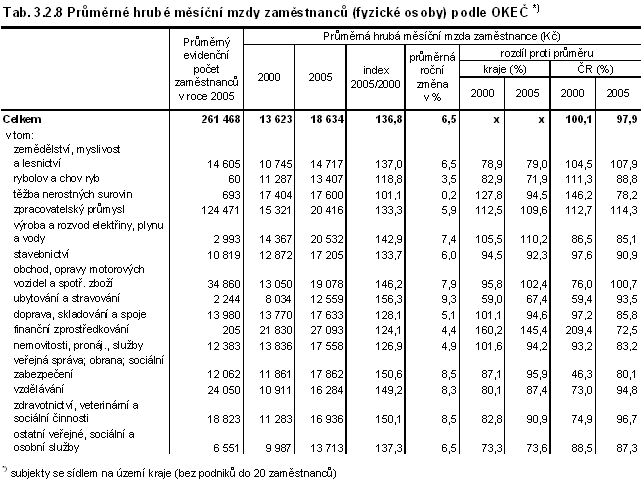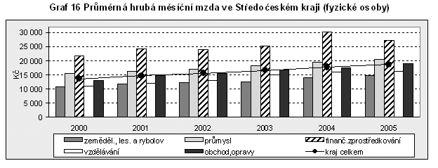 Absolutně nejvyšších mezd dosahují pracovníci v odvětví finančního zprostředkování, peněžnictví a pojišťovnictví, jejichž průměrná mzda v roce 2005 překročila 27 tisíc Kč a byla o 8,5 tisíce korun vyšší než průměrná mzda v kraji a 2,2krát vyšší než v odvětví s nejnižší průměrnou mzdou. Tím je oblast ubytování a stravování, kde průměrná mzda i přes poměrně vysoké tempo růstu proti roku 2000 dosáhla v roce 2005 jen 12 559 Kč.