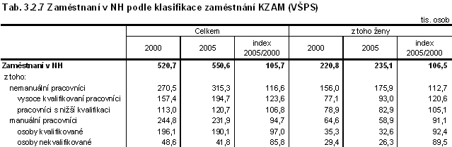 Na celkovém počtu zaměstnaných v NH se v roce 2005 nemanuální pracovníci podíleli 57,3 %, manuálně pracující 42,1 %. Podíl nemanuálních pracovníků na celkovém počtu zaměstnaných v NH vzrostl ve sledovaném období o 5,3 procentního bodu, naproti tomu podíl manuálních pracovníků se proti roku 2000 téměř o 5 procentních bodů snížil. Počet nemanuálních pracovníků proti roku 2000 poměrně výrazně vzrostl. Jejich celkový počet se zvýšil téměř o 45 tis. osob, přičemž počet vysoce kvalifikovaných nemanuálních pracovníků vzrostl o 37,2 tis. osob, to je téměř o 24 %, počet nemanuálních pracovníků s nižší kvalifikací rostl výrazně pomaleji, jejich počet se zvýšil o 7,6 tis. osob, to je pouze o 6,8 %.