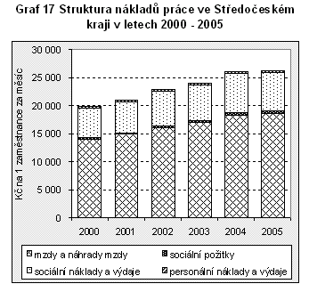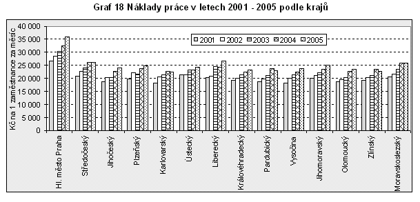 Rozdíl mezi nejvyššími a nejnižšími náklady práce v krajích v roce 2005 představoval 13 898 Kč, což je téměř polovina celorepublikového průměru. Velký rozdíl způsobují jednak rozdíly v odvětvové struktuře jednotlivých krajů v České republice a především Hl. město Praha, kde sídlí větší podniky a instituce s vyšší úrovní mezd a platů, zejména v oblasti finančnictví, veřejné správy a obrany. Mají zde sídlo zahraniční firmy a podniky s mezinárodní účastí, kde jsou nejen značně vysoké mzdy a platy, ale tyto firmy poskytují svým zaměstnancům i řadu nadstandardních sociálních výhod, což se pak odráží i ve výrazně vyšších sociálních požitcích a sociálních nákladech a výdajích na zaměstnance. Např. náklady práce na jednoho pracovníka měsíčně vynaložené na sociální požitky v roce 2005 v Hl. městě Praze byly více než 2,5krát vyšší než představoval průměr všech ostatních krajů v ČR. Proti Středočeskému kraji byly náklady na sociální požitky v Hl. městě Praze 2,5krát vyšší, proti Pardubickému kraji, který měl v roce 2005 náklady na sociální požitky na jednoho zaměstnance měsíčně nejnižší v ČR, byly tyto náklady v Hl. městě Praze vyšší dokonce 3,5krát.