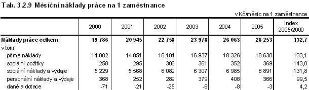 Přímé náklady, které tvoří mzdy a náhrady mezd, dosáhly v roce 2005 celkem 18 630 Kč na jednoho zaměstnance za měsíc a proti roku 2000 byly vyšší o 33,1 %. Mzdy představovaly 16 743 Kč na jednoho zaměstnance měsíčně a tvořily 91,3 % z přímých nákladů, náhrady mezd za neodpracovanou dobu dosáhly v roce 2005 celkem 1 887 Kč na jednoho zaměstnance měsíčně a na přímých nákladech se podílely 7,7 %.