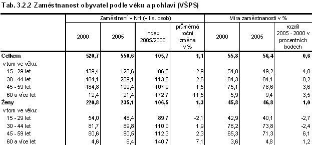 Míra zaměstnanosti žen v roce 2005 dosáhla 46,8 % a proti roku 2000 byla vyšší o jedno procento. Ke zvýšení míry zaměstnanosti došlo v obou starších věkových skupinách, významněji – o 6,1 % u skupiny 45-59 let, mladší dvě věkové skupiny, tj. 15-29 let a 30-44 let zaznamenaly ve sledovaném období pokles míry zaměstnanosti převyšující dvě procenta. U mužů byl celkový nárůst míry zaměstnanosti proti ženám pouze desetinový, k poklesu míry zaměstnanosti došlo pouze u skupiny mužů ve věku 15-29 let, a to o 6,7 procentního bodu. Ostatní věkové skupiny mužů zaznamenaly nárůst míry zaměstnanosti, nejvýrazněji se nárůst projevil u nejstarší věkové skupiny nad 60 let, kde při téměř dvojnásobném zvýšení počtu zaměstnaných proti roku 2005 došlo ke zvýšení míry zaměstnanosti o 6,5 procentního bodu.
