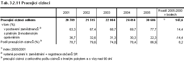 Výrazně rychleji se v průběhu sledovaného období zvyšoval počet pracujících cizinců v postavení zaměstnanců, který vzrostl z 13 167 osob v roce 2001 na 23 845 osob v roce 2005. Nárůst o více než 80 % přinesl i zvýšení podílu této kategorie na celkovém počtu pracujících cizinců v roce 2005 na 77,7 %, to je o 14,4 procentního bodu proti podílu v roce 2001. Naproti tomu, počet pracujících cizinců s platným živnostenským oprávněním v průběhu sledovaného období poklesl o více než 10 %. Jejich počet se v letech 2001 až 2005 snížil ze 7 622 osob na 6 841 osob a podíl této skupiny na celkovém počtu pracujících cizinců klesl ve sledovaném období o více než 14 procentních bodů.