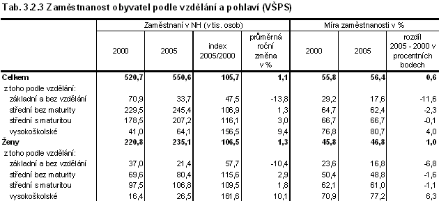Od roku 2000 došlo k výraznému růstu vzdělanosti zaměstnaných osob, což odpovídá trendu, který můžeme zaznamenat v populaci jako celku. Podíl osob se základním vzděláním poklesl o 7,5 procentního bodu, podíl zaměstnaných s maturitou vzrostl o 3,4 procentního bodu. Nejvyšší nárůst zaznamenal podíl vysokoškolsky vzdělaných zaměstnaných a sice o 3,8 procentního bodu. V roce 2005 tvořili vysokoškolsky vzdělaní téměř 12 procent ze všech zaměstnaných osob. Celkový počet vysokoškolsky vzdělaných zaměstnaných vzrostl proti roku 2000 o více než 23 tis. osob, to je o 56,5 % při průměrné roční změně přesahující 9 procentních bodů.