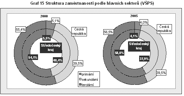 V průběhu sledovaného období i nadále trval trend přesouvání pracovní síly z primárního a ze sekundárního sektoru do sektoru terciárního. Ještě výrazněji se tato tendence projevovala zejména ve druhé polovině devadesátých let. Od roku 1993 se zvýšil podíl zaměstnaných v terciárním sektoru o více než 23 procentních bodů, zejména na úkor sekundárního sektoru.