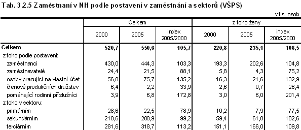 Nejcharakterističtějším rysem vývoje zaměstnanosti podle tohoto ukazatele je růst počtu pracujících na vlastní účet; proti roku 2000 vzrostl jejich počet téměř o 20 tisíc, to je více než 35 %. Trvale se zvyšuje počet pomáhajících rodinných příslušníků (od roku 2000 vzrostl téměř o tři čtvrtiny), který v roce 2005 již převýšil stále klesající počet členů produkčních družstev.