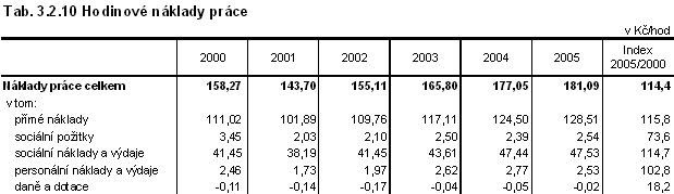 Nárůst hodinových přímých nákladů (tj. mezd a náhrad mezd), byl o 1,4 procentního bodu rychlejší než nárůst celkových průměrných hodinových nákladů práce, sociální náklady a výdaje na jednoho zaměstnance v Kč/hod vzrostly v průběhu sledovaného období o 14,7 procentního bodu při průměrném ročním přírůstku o 2,8 procentního bodu. Hodinové náklady práce na sociální požitky naproti tomu zaznamenaly pokles na 73,6% hodnoty roku 2000.