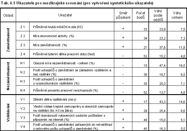 Stejně jako v celé publikaci bylo i mezikrajské srovnání zpracováno nejprve ve třech základních oblastech – vzdělávání, zaměstnanosti a nezaměstnanosti. Každou z těchto oblastí charakterizuje v konečné fázi jediný syntetický ukazatel. Přitom tento syntetický ukazatel nemá povahu konkrétního obecného ukazatele, ale je vypočítán z jednotlivých dílčích charakteristik (i když i tyto mohou mít „syntetizující“ význam). Na tuto část pak navazuje závěrečný krok, kdy byly sloučeny všechny tři zkoumané oblasti do jednoho celku ve snaze vyjádřit postavení konkrétního kraje jedinou hodnotou.