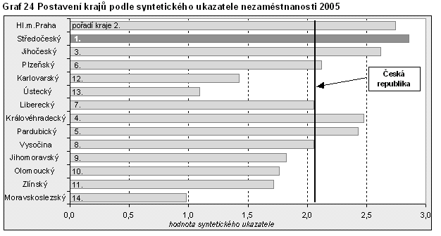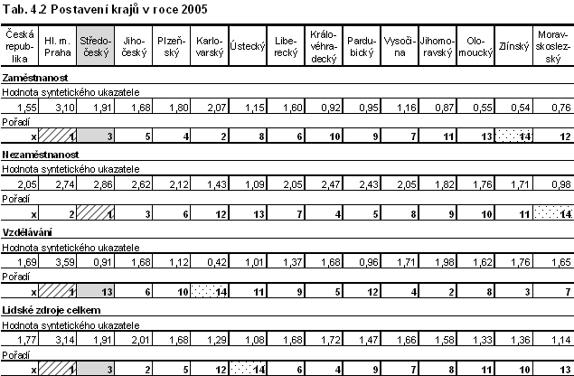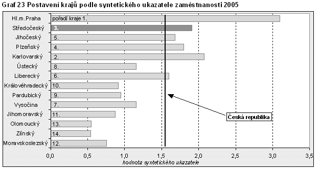 Hodnota syntetického ukazatele zaměstnanosti (dále jen ukazatel zaměstnanosti) je mezi kraji značně variabilní a v podstatě dělí regiony do tří základních skupin. První skupina je tvořena jediným územním útvarem, a to Hl. městem Prahou, kde ukazatel zaměstnanosti dvojnásobně převyšuje republikový průměr. Protipólem je skupina osmi krajů, které dosáhly hodnot významně podprůměrných. Střední pásmo je pak tvořeno 5 kraji - všechny s hodnotou ukazatele nad průměrem republiky.
