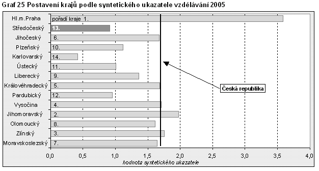 Hodnocení úrovně vzdělávání podle zkonstruovaného syntetického ukazatele (dále jen ukazatel vzdělávání) v mezikrajském srovnání rozděluje regiony na dvě skupiny. První skupinu tvoří územní oblasti s extrémní hodnotou ukazatele vzdělávání, reprezentované na obou pólech vždy jedním krajem. Druhá skupina pak zahrnuje zbytek krajů, u nichž diference ve výši ukazatele vzdělávání nejsou již tak propastné. Po Jihomoravském kraji, který mezi regiony dosahuje druhé nejvyšší hodnoty ukazatele vzdělávání, následuje 6 krajů, kde výše tohoto ukazatele osciluje těsně kolem republikového průměru. Na 9. a 10. místě jsou pak kraje Liberecký a Plzeňský s poněkud většími diferencemi v hodnotách a závěr skupiny tvoří 3 kraje opět jen s minimálními rozdíly.