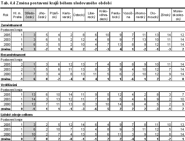 Při hodnocení vývoje lidských zdrojů podle krajů vyvstane ještě více problémů než při posuzování výsledků jediného roku. Jednak je zvolené období let 2000 až 2005 pro zjištění zásadnějších vývojových tendencí poměrně krátké. Mimo to běžně užívané hodnocení na základě vývojových indexů v zásadě omezuje zkoumání dynamiky pouze na krajní roky sledovaného období a již nepřihlíží k možným změnám trendů uvnitř sledovaného období. Svou roli hrají i změny v organizačním uspořádání státu a role krajů v roce jejich vzniku (rok 2000) byla určitě v reálu jiná než po pěti letech v roce 2005. Zásadní problém ale spočívá v datových zdrojích. Bez problému lze získat data jak v oblasti zaměstnanosti, tak nezaměstnanosti. Pro úsek vzdělávání však řada údajů již chybí a odpovídající údaje jsou dostupné v plné šíři jen za poslední 3 roky. Chceme-li nějakým způsobem dopočítat i výchozí úroveň – tedy rok 2000, nezbývá nic jiného, než se uchýlit k dopočtům a odhadům.
