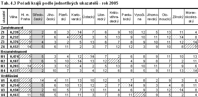 Detailnější možnost srovnání pozic jednotlivých krajů jak v souhrnu, tak podle konkrétních vstupních ukazatelů umožňují dvě následující tabulky. Označení ukazatelů v tab. 4.3 odpovídá ukazatelům uvedeným výše v tab. 4.1.