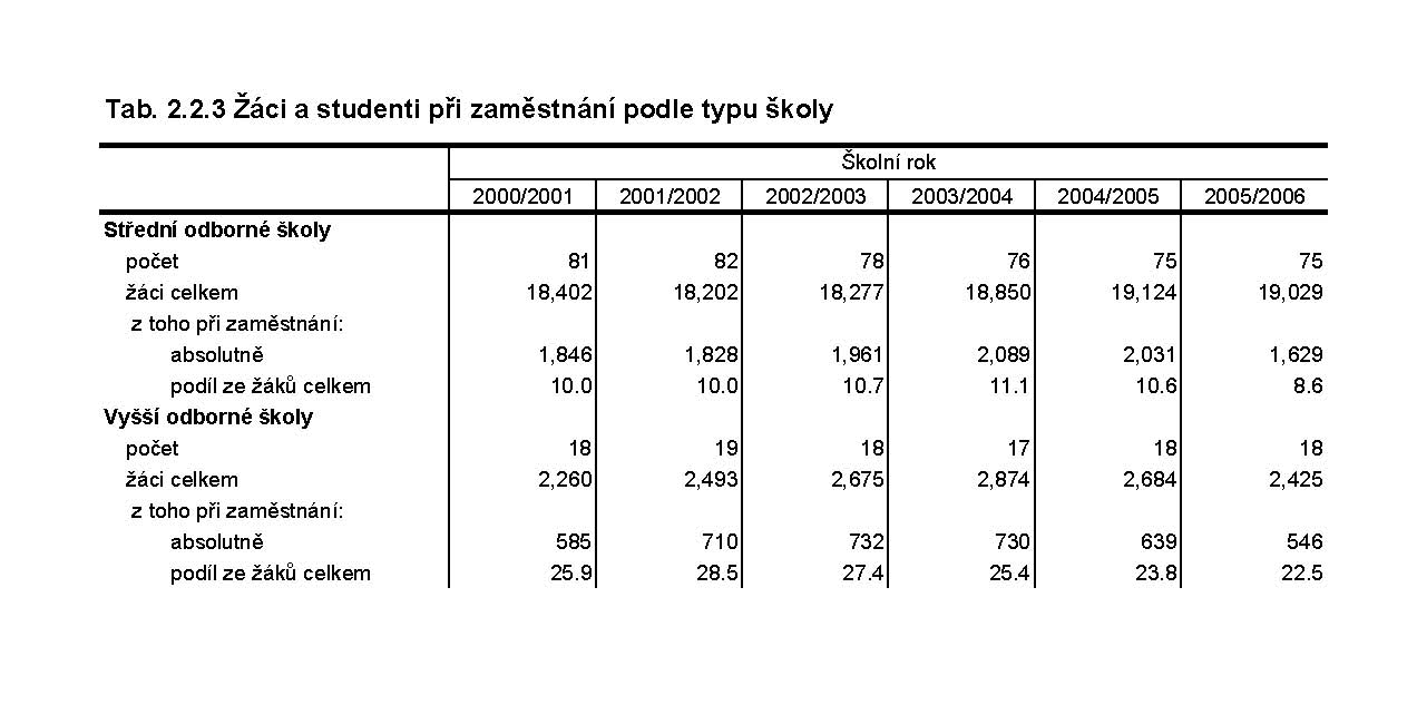 Tab. 2.2.3 Žáci a studenti při zaměstnání podle typu školy