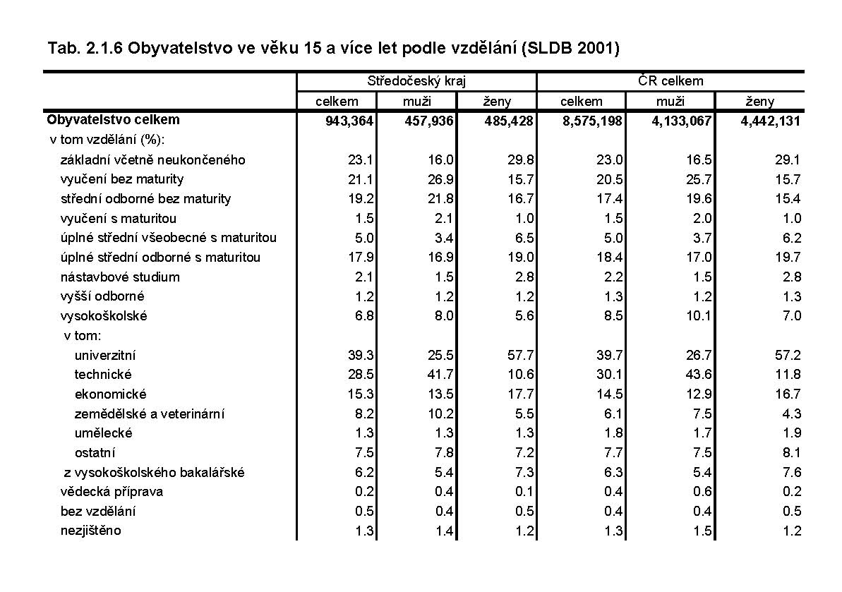Tab. 2.1.6 Obyvatelstvo ve věku 15 a více let podle vzdělání (SLDB 2001)