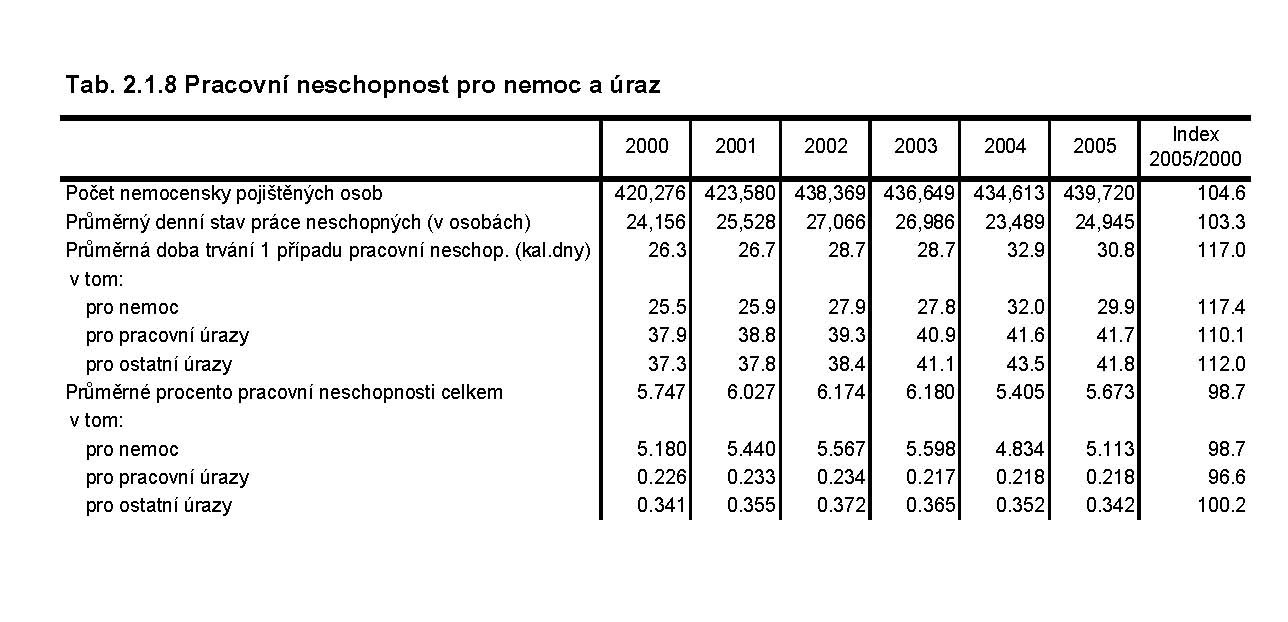 Tab. 2.1.8 Pracovní neschopnost pro nemoc a úraz