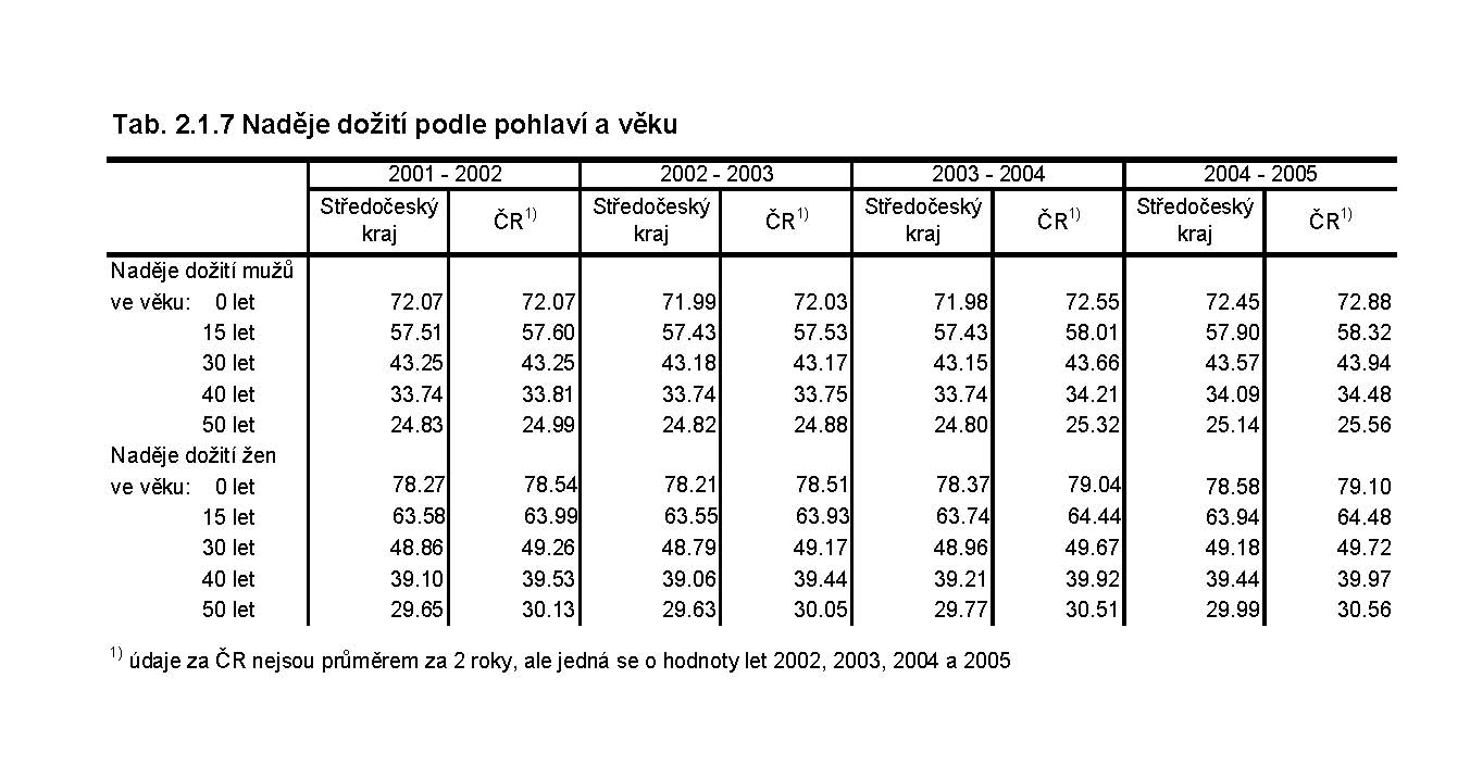 Tab. 2.1.7 Naděje dožití podle pohlaví a věku