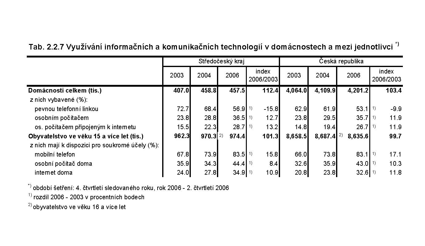 Tab. 2.2.7 Využívání informačních a komunikačních technologií v domácnostech a mezi jednotlivci