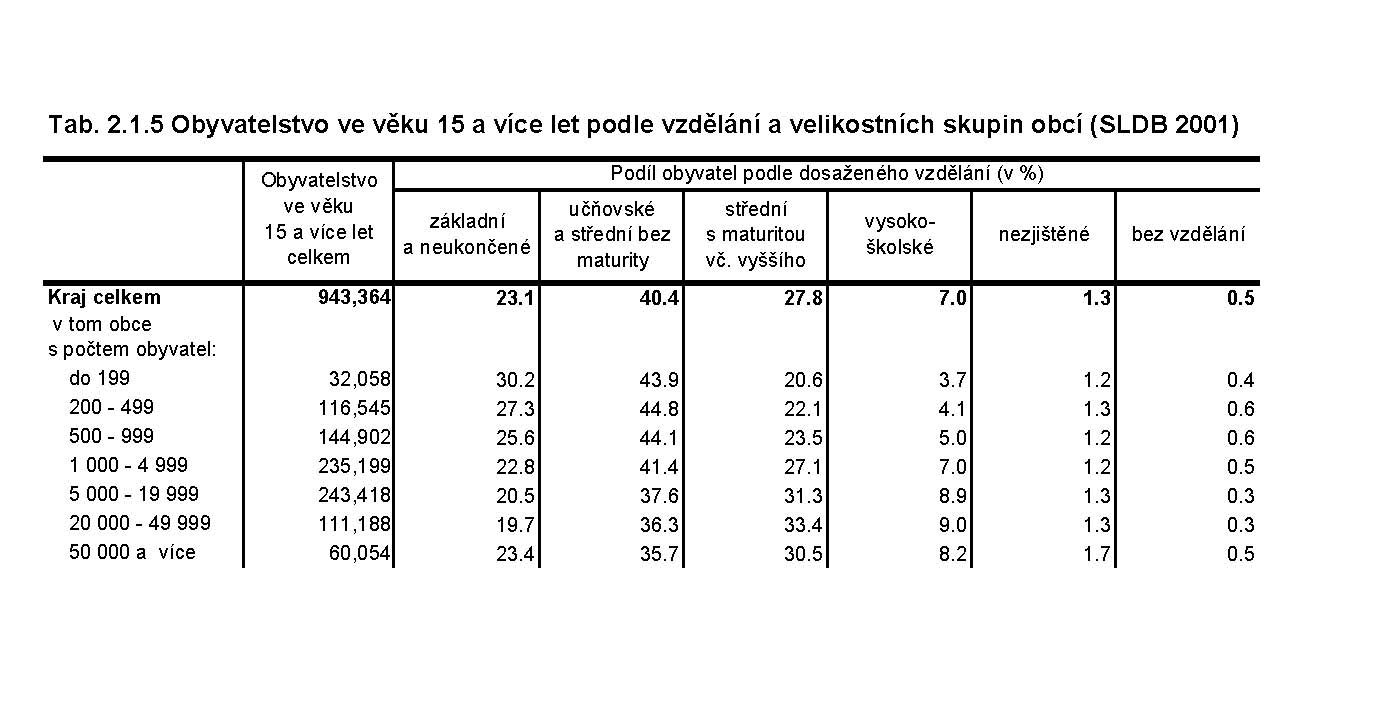 Tab. 2.1.5 Obyvatelstvo ve věku 15 a více let podle vzdělání a velikostních skupin obcí (SLDB 2001)