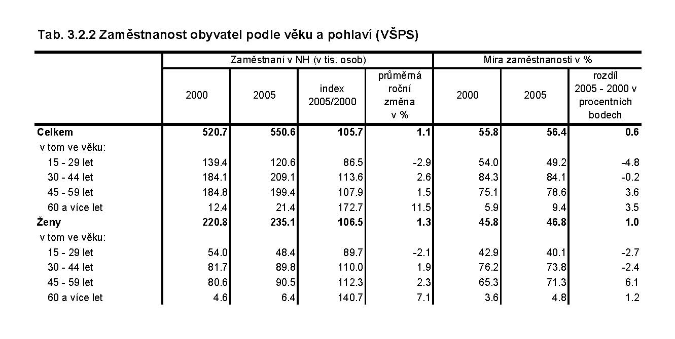 Tab. 3.2.2 Zaměstnanost obyvatel podle věku a pohlaví (VŠPS)