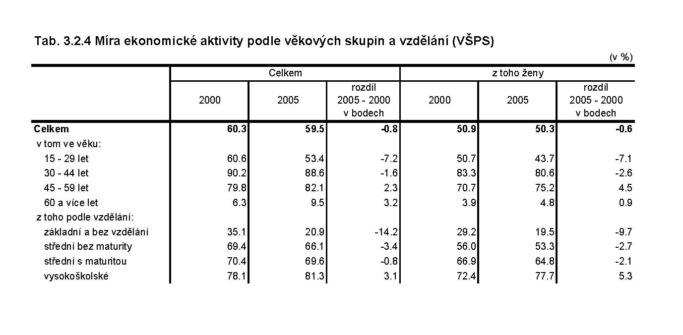 Tab. 3.2.4 Míra ekonomické aktivity podle věkových skupin a vzdělání (VŠPS)