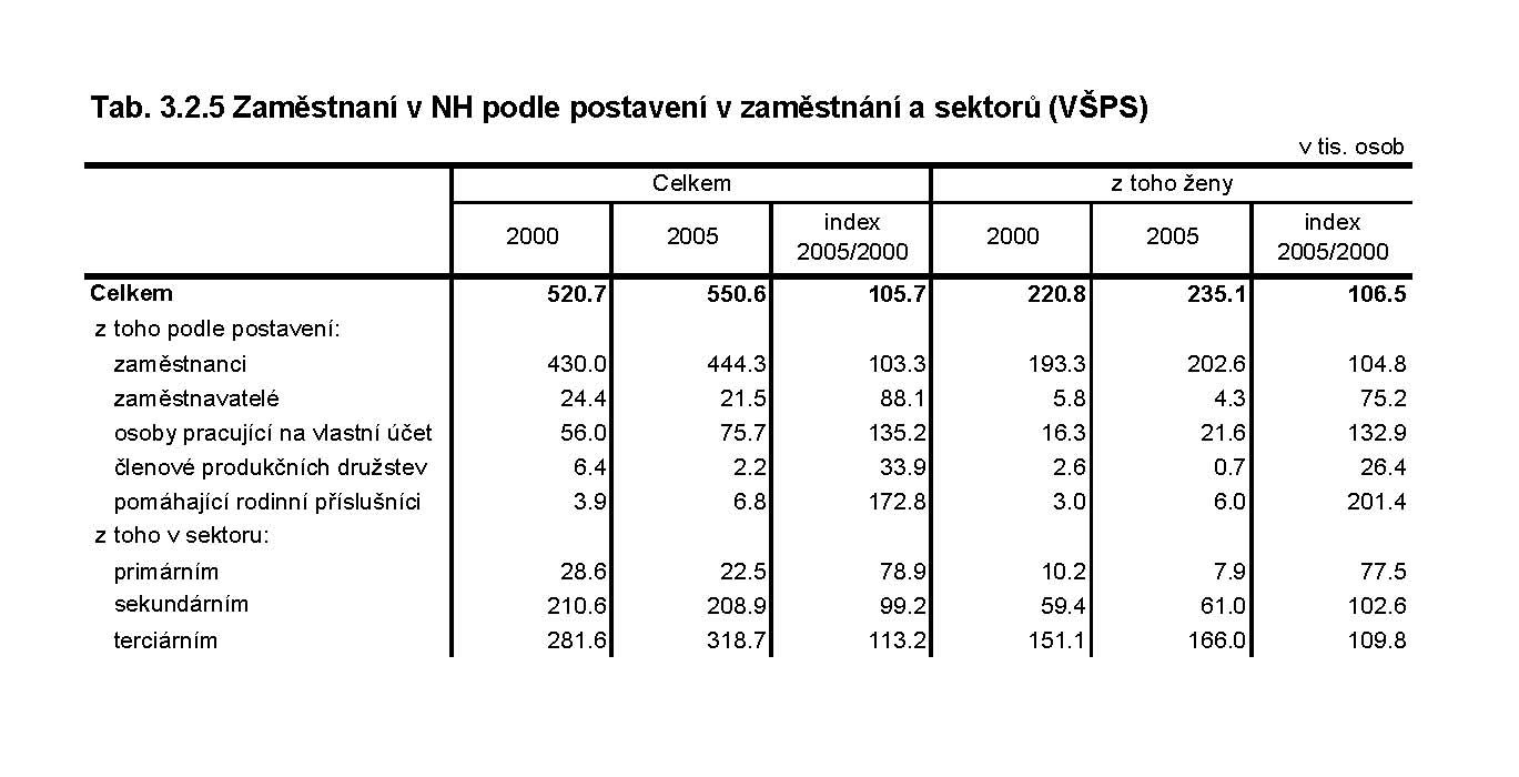 Tab. 3.2.5 Zaměstnaní v NH podle postavení v zaměstnání a sektorů (VŠPS)