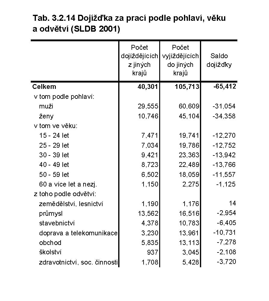 Tab. 3.2.14 Dojížďka za prací podle pohlaví, věku a odvětví (SLDB 2001)