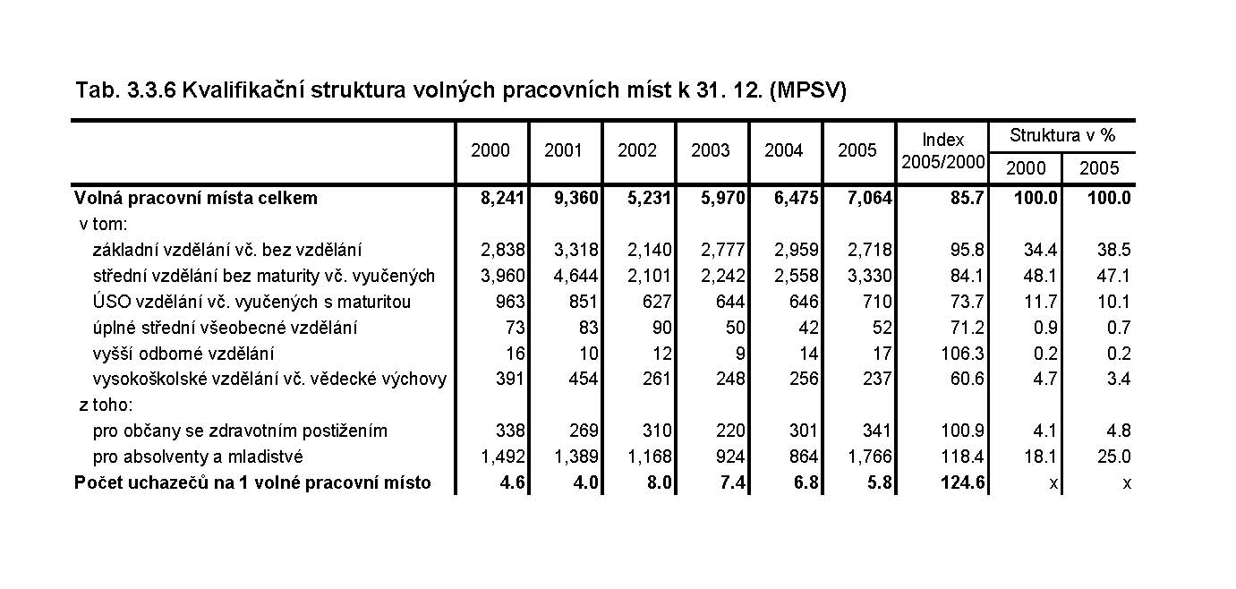 Tab. 3.3.6 Kvalifikační struktura volných pracovních míst k 31. 12. (MPSV)