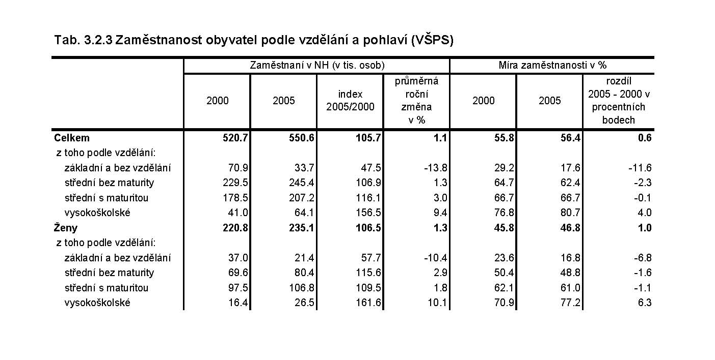 Tab. 3.2.3 Zaměstnanost obyvatel podle vzdělání a pohlaví (VŠPS)