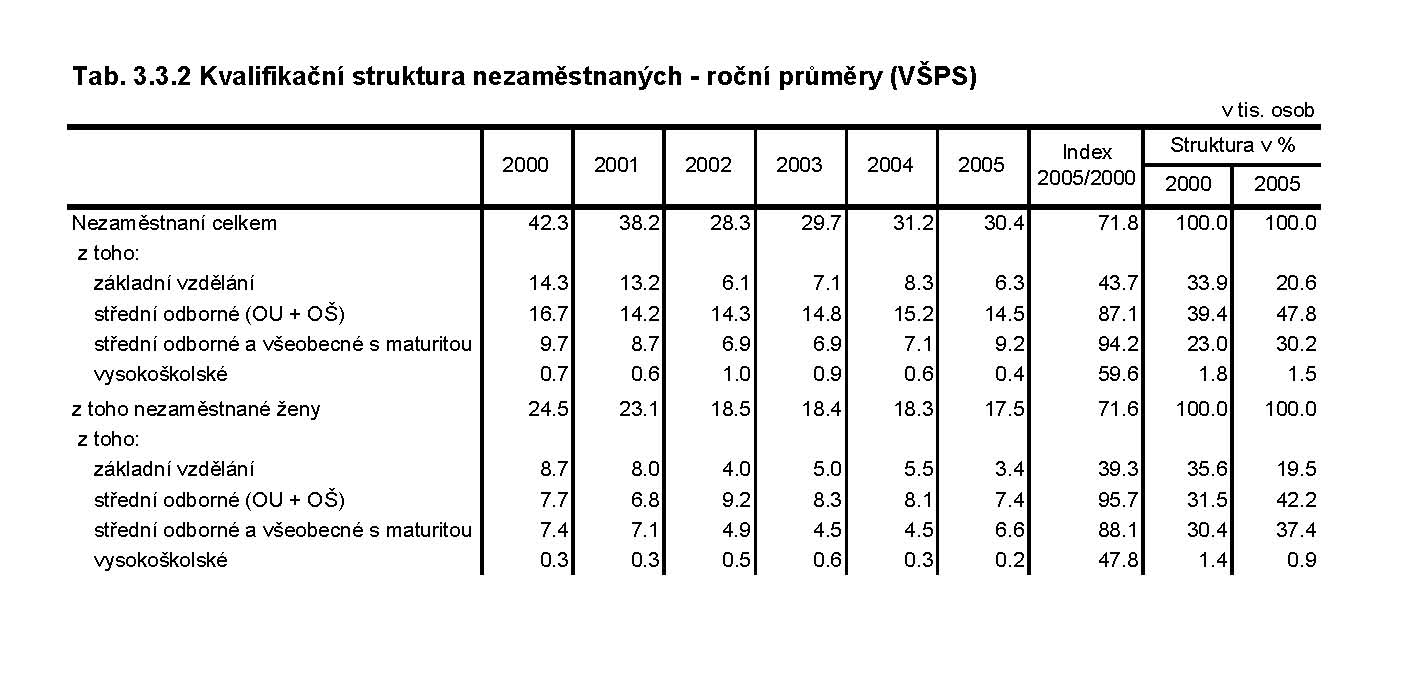 Tab. 3.3.2 Kvalifikační struktura nezaměstnaných - roční průměry (VŠPS)