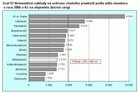 Graf 53 Neinvestiční náklady na ochranu život. prostředí podle sídla investora v roce 2006 v Kč na obyv.