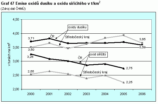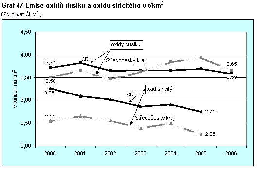 Graf 47 Emise oxidů dusíku (REZZO 1-4) a oxidu siřičitého (REZZO 1-3) v tunách na km2