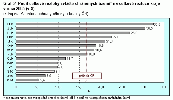 Graf 54 Podíl celkové rozlohy zvláště chráněných území na celkové rozloze kraje v roce 2005 (v %)