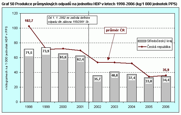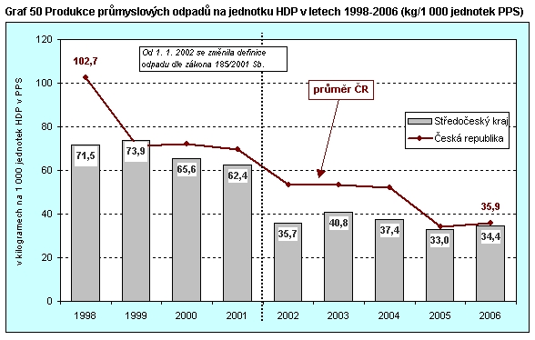 Graf 50 Produkce průmyslových odpadů na jednotku HDP v letech 1998-2006