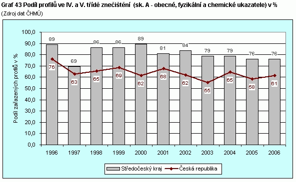 Graf 43 Podíl profilů ve IV. a V. třídě znečištění (sk. A - obecné, fyzikální a chemické ukazatele) v %