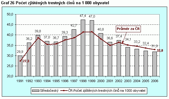 Graf 26 Počet zjištěných trestných činů na 1 000 obyvatel