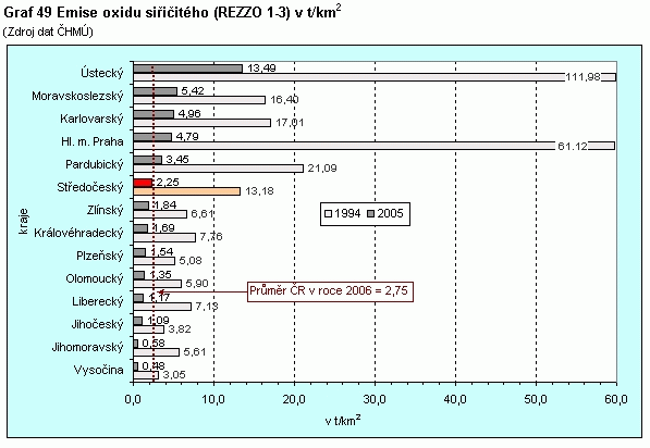 Graf 49 Emise oxidu siřičitého (REZZO 1-3) v t/km2